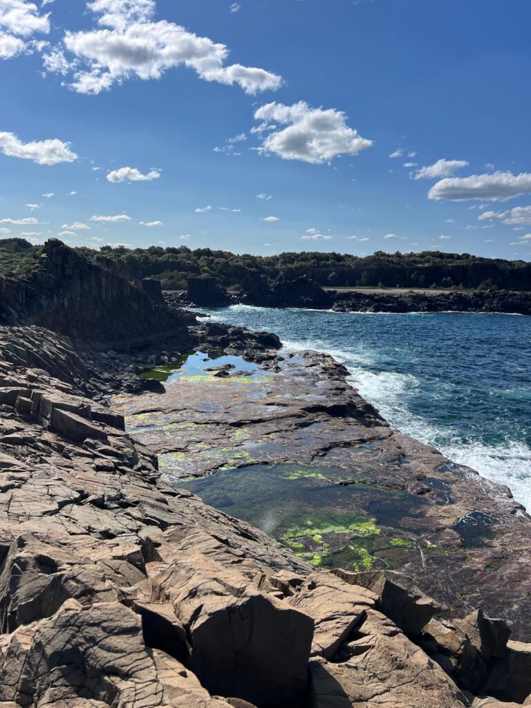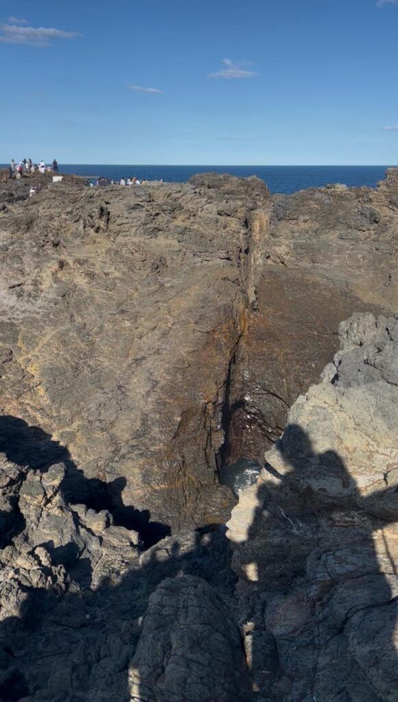 Dort wollten wir uns, wie empfohlen, die steilen Bombo-Klippen und das Blow Hole anschauen. Scheinbar kann das Wasser hier bis zu 30 Meter hoch schießen – allerdings waren es bei uns eher so 5 Meter. 😅 Neben den hundert kleinen Asiaten hatten wir dennoch einen guten Blick auf das Spektakel und zogen nach einer halben Stunde aber weiter.