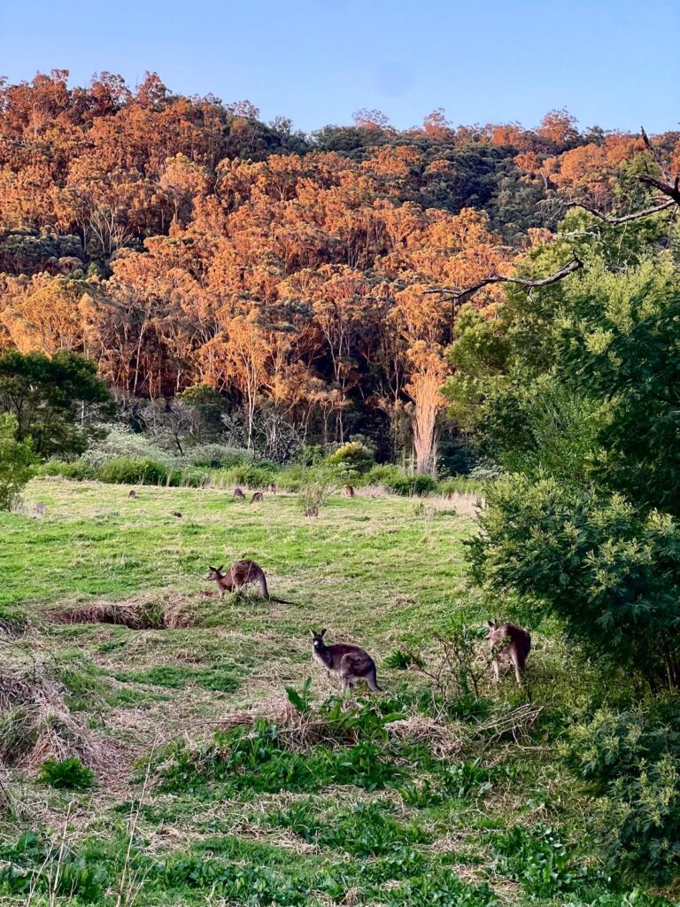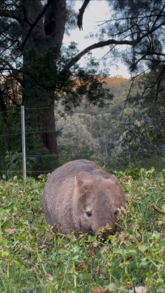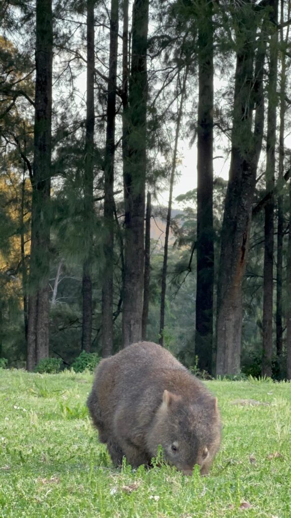 In der späten Nachmittagssonne wanderten wir den Waldrand entlang und konnten direkt den ersten braunen Fellknäul in der Ferne entdecken! Friedlich am Grasen ließen sich die vielen Tierchen gar nicht aus der Ruhe bringen. In Summe konnten wir bestimmt zehn verschiedene Wombats aus nächster Nähe beobachten und glücklich zum Abendessen zurück an unser Auto gehen.