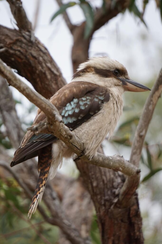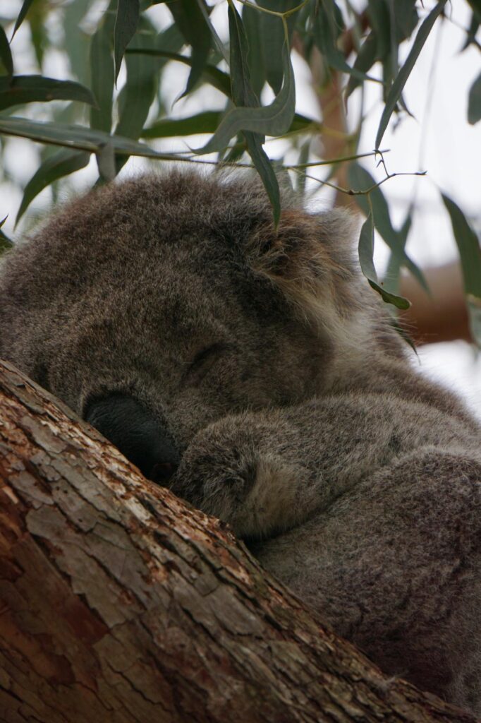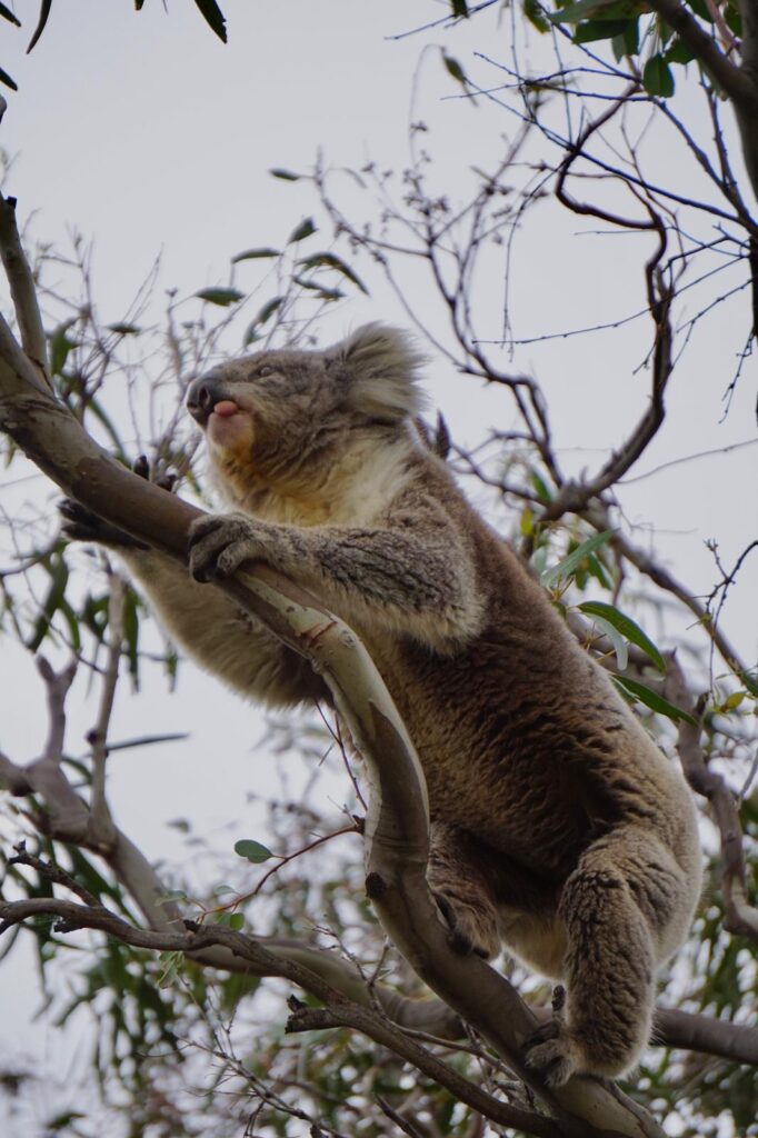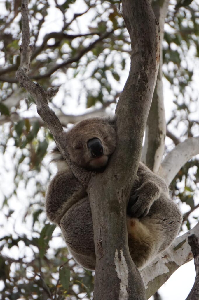 Am nächsten Morgen stand ein absolutes Highlight auf dem Tagesprogramm. Wir hatten online von der kleinen Insel Raymond Island gelesen und den dort lebenden flauschigen Bewohnern. 🐨 Wir konnten direkt vor der Fähre unseren Van parken und als Fußgänger kostenfrei mitfahren. In nicht mal 10 Minuten kamen wir auf der anderen Seite an und wurden direkt neben dem Steg von zwei Koalas in der Baumkrone begrüßt. Voller Vorfreude ging es mit dem Kopf im Nacken und Blick nach oben entlang der zwei Wanderwege über die kleine Insel. Unsere Erwartungen wurden bei weitem übertroffen und wir konnten tatsächlich 28 verschiedene Bärchen in den Eukalyptusbäumen beobachten. Während die meisten friedlich in einer Astgabel schlummerten hatten wir sogar das Glück, drei Stück beim Fressen und Klettern zuzuschauen.