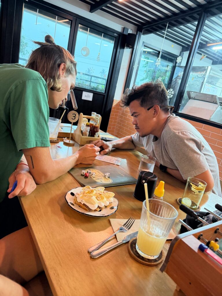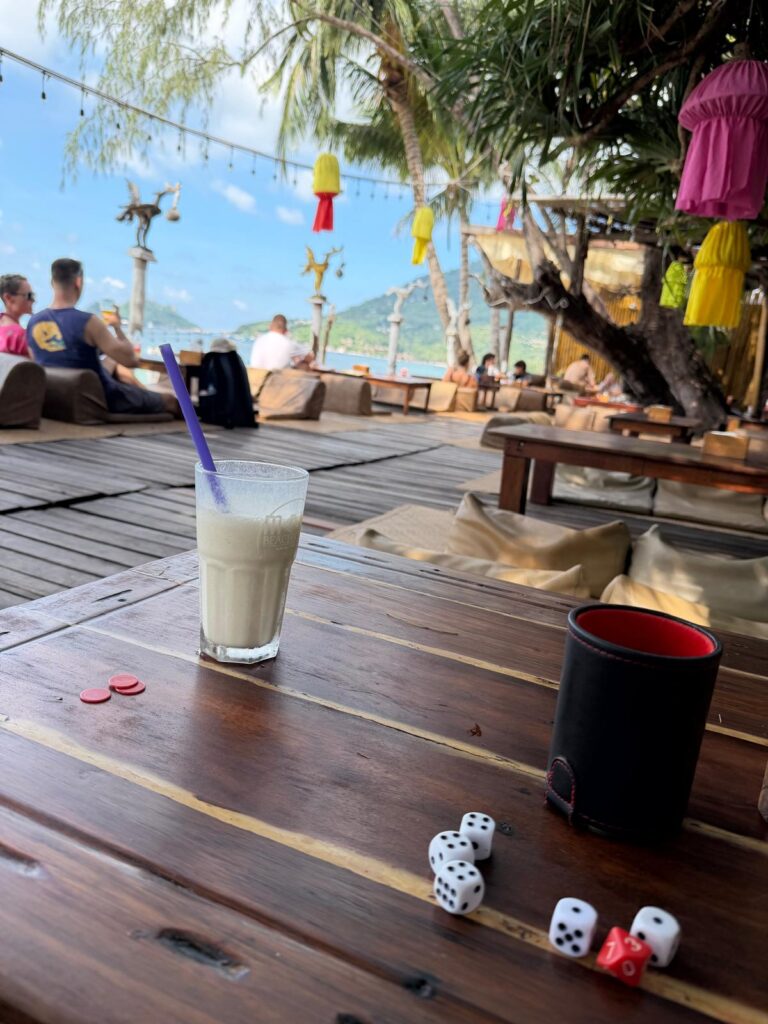Ansonsten haben wir häufig Zeit mit unserem Freund Aex verbracht, der ebenfalls Tauchlehrer bei Crystal ist und ihm beispielsweise an einem Regentag Kniffel spielen beigebracht. Zudem war Kristin wieder in der Local Bar zu einem Quizabend, wir haben bei einem Café Postkarten gemalt und einfach die tollste Insel der Welt für in Summe 18 Tage genossen. 🏝️ Thailand war wirklich nochmal ein wunderschöner Abschluss für unsere Reise! 🇹🇭🥰